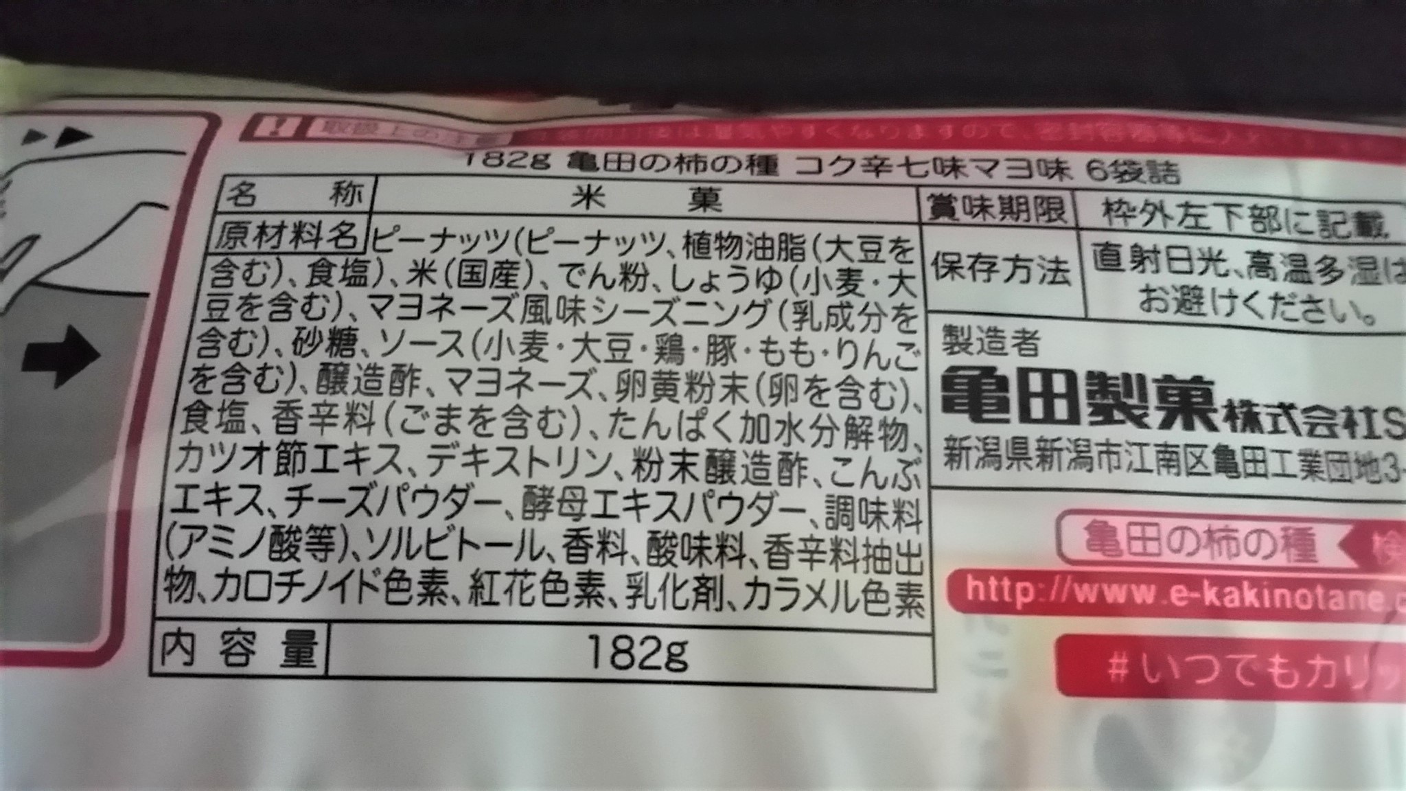 普通の亀田の柿の種はツルツルの食感だけど、こちらの食感としてはザラザラした感じ。七味唐辛子の粉が付着している関係か、マヨのシーズニングの関係かな。